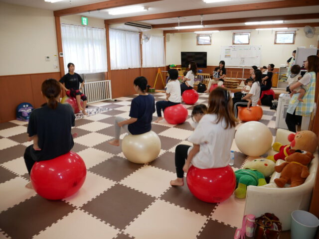 今回は専門講師による「親子バランスボール遊び」を行ないました。音楽に合わせて弾んだり、ウォーキングやステップをして有酸素運動をしました。ママに抱っこされながら気持ちよさそうにウトウト寝てしまうお友達もいましたね!体幹を鍛えるとても楽しい時間を過ごすことができましたね!